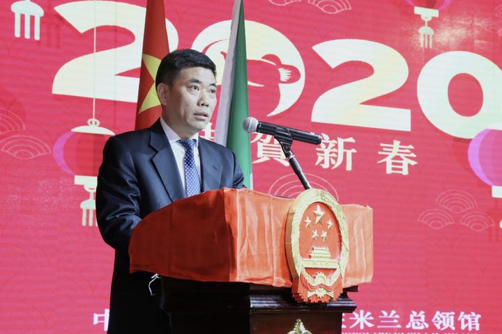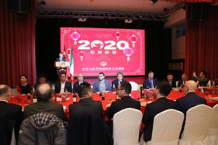 宋总强调,2019年,习主席对意大利进行历史性访问,两国首脑成功签署“一带一路”谅解备忘录,全面战略伙伴关系注入新动力,两国关系持续发展。推进葡萄园景观与云南哈尼梯田、与杭州两会世界文化遗产地合作,打造遇见中国活动平台,促进经贸对接和人文交流与条件规范,成功举办70年图片巡回展,提升服务质量,增加便民措施,开展领保进校园、进公司、进机场活动,切实维护中国公民和法人的人身财产安全和合法权益。 宋总说,我们得到侨团、侨胞、中资企业、留学生以及媒体等方方面面的大力支持。在此,我向你们表示衷心的感谢。 宋总表示,今年是中意建交50周年,两国政府举办的文化旅游年昨天已经开幕,该活动将认真落实两国领导人达成积极推动中意友好合作,希望领区同胞,发扬传统,只争朝夕,不负韶华,在追寻人生梦想的同时,为实现中华民族伟大复兴贡献力量。特别感谢意大利友人与我们共庆佳节,感谢你们一直以来,对中国发展的支持和对中意友好的支持。 最后,宋总再次祝大家新春快乐,万事如意,鼠年大吉。