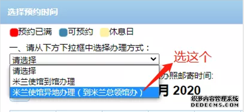 第二步选择时间:信息全部填写完成后点击“进入预约”,请在办理方式一栏中选择第二种方式,即“米兰使馆异地办理(到米兰总领馆办)”(见下图),选择可预约的办理日期。